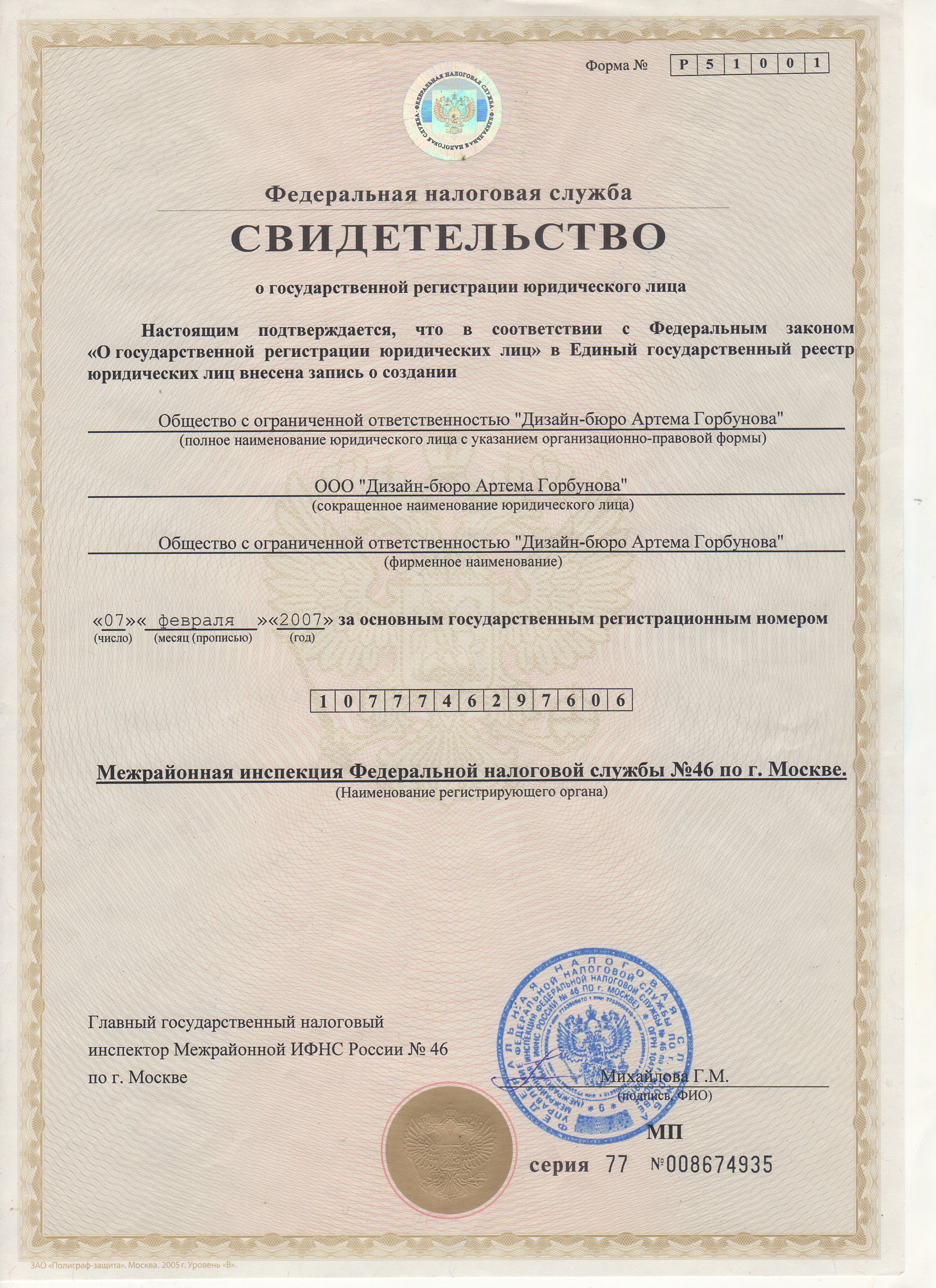 ОГРН 1077746297606