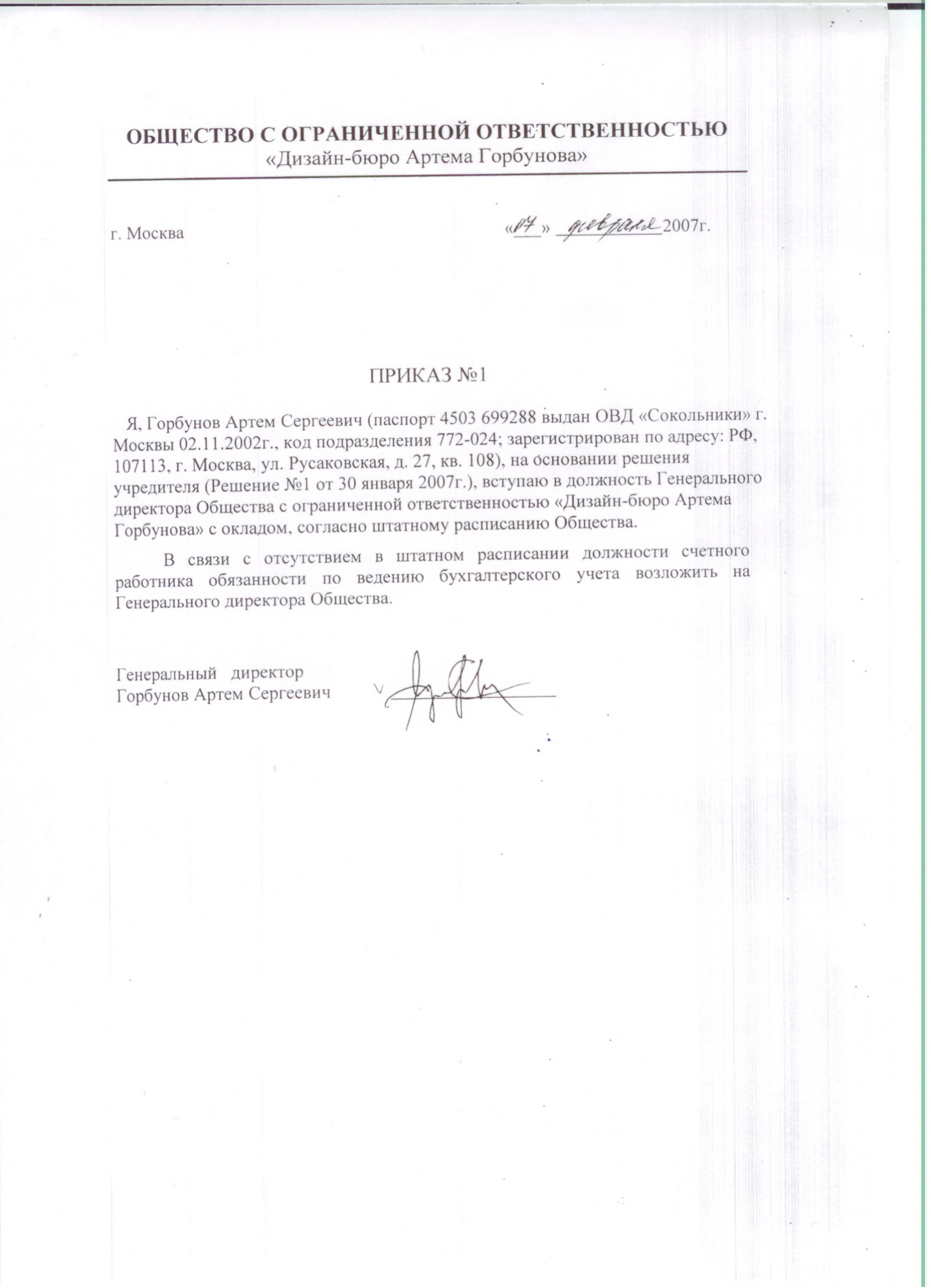 Приказ о вступлении в должность гендиректора