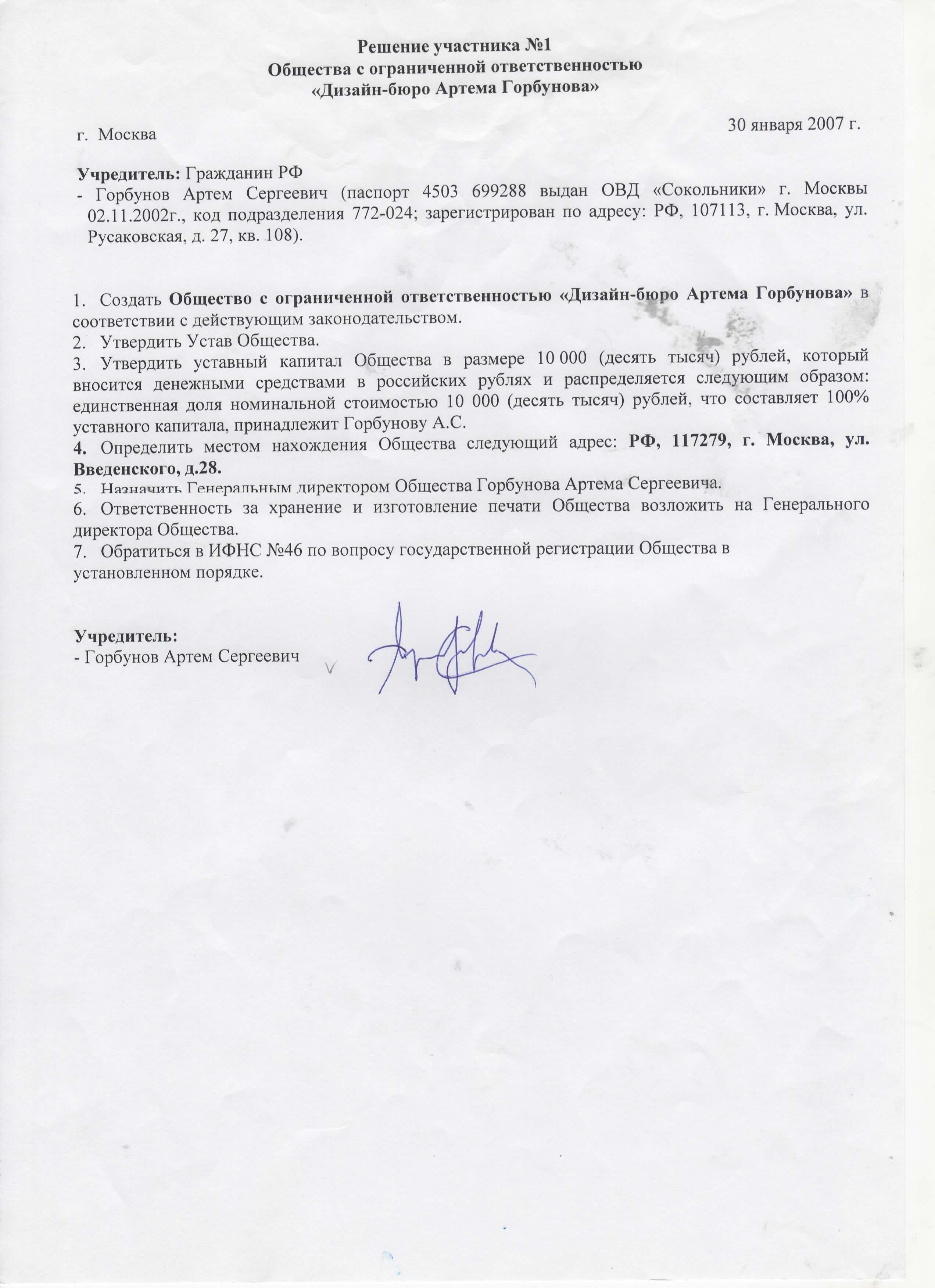 Решение о создании ООО