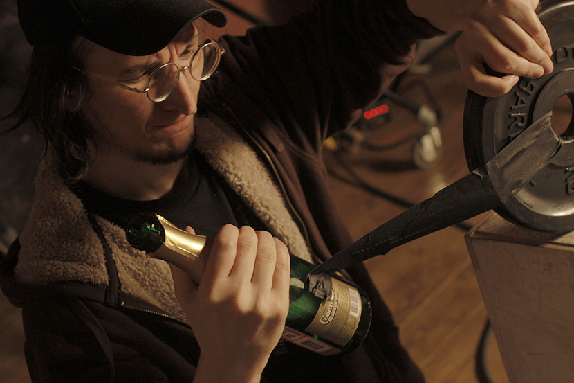 Только после начала съёмки выясняется, что камера способна снимать только 17 секунд на высокой скорости — в это время должен уложиться залп. В результате оператор должен был успеть растрясти бутылку, установить фокус и начать снимать в тот момент, когда бутылка готова дать залп. Если начинали снимать раньше, то струя не попадала в 17 секунд, если позже — упускали сам залп. В первый день ушло сразу десять бутылок шампанского вместо запланированных пяти, а удачных дублей получилось только два. |