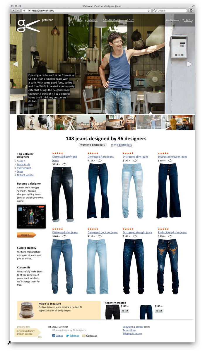 В интернет-магазине Гетвеара покупатели выбирают, придумывают, оценивают, примеряют, покупают и продают джинсы, которые Гетвеар производит и доставляет: |