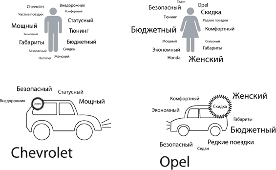 Система рекомендацийСтандартная навигация по каталогу не очень хорошо решает задачу продажи. Поэтому выбор автомобиля построен на персональных рекомендациях. Автоматические рекомендации основаны на постоянно накапливаемых знаниях. Знания о предпочтениях человека сохраняются и уточняются при каждом его клике — он может смотреть то на хетчбек, то на джип. Если три раза кликает в хетчбек, это сильно придаёт очков соответствующим рекомендациям. Знания о человеке и автомобилях хранятся в виде взвешенных тегов: |