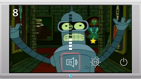 Благодаря тому, что всё управление перенесено на экран, больше не придётся разглядывать кнопки пульта в темноте. ТелевизорЕсли направить вейвер на телевизор, на экране появится номер канала и индикатор громкости |