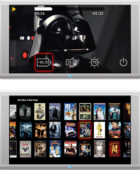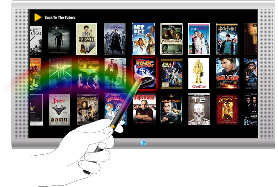 | «Командор» — это новый пользовательский интерфейс телевизоров, домашних кинотеатров, медиацентров и любой другой аудио- и видеотехники, подключенной к телевизору. Он управляется дистанционным пультом всего с двумя кнопками — вейвером. «Командор» распознает направление движения вейвера. |