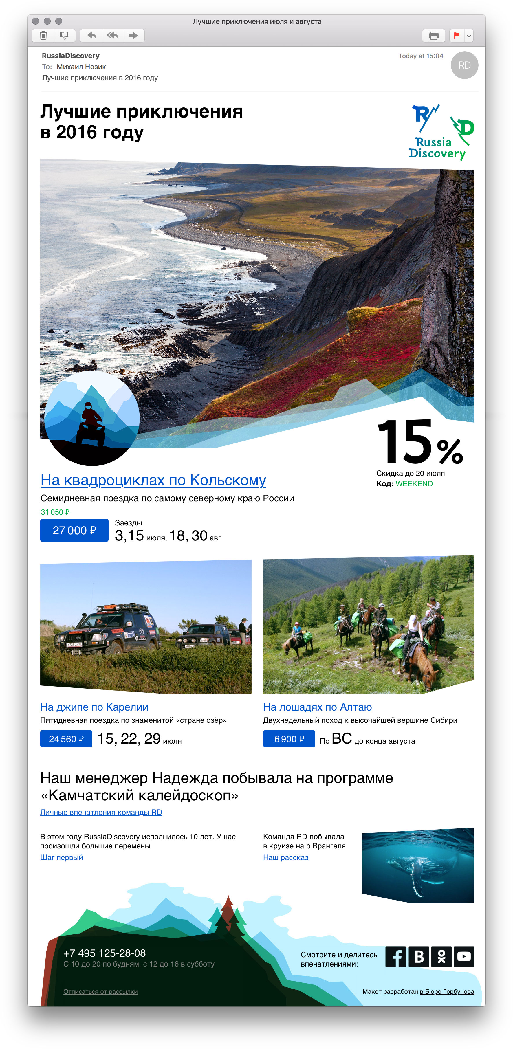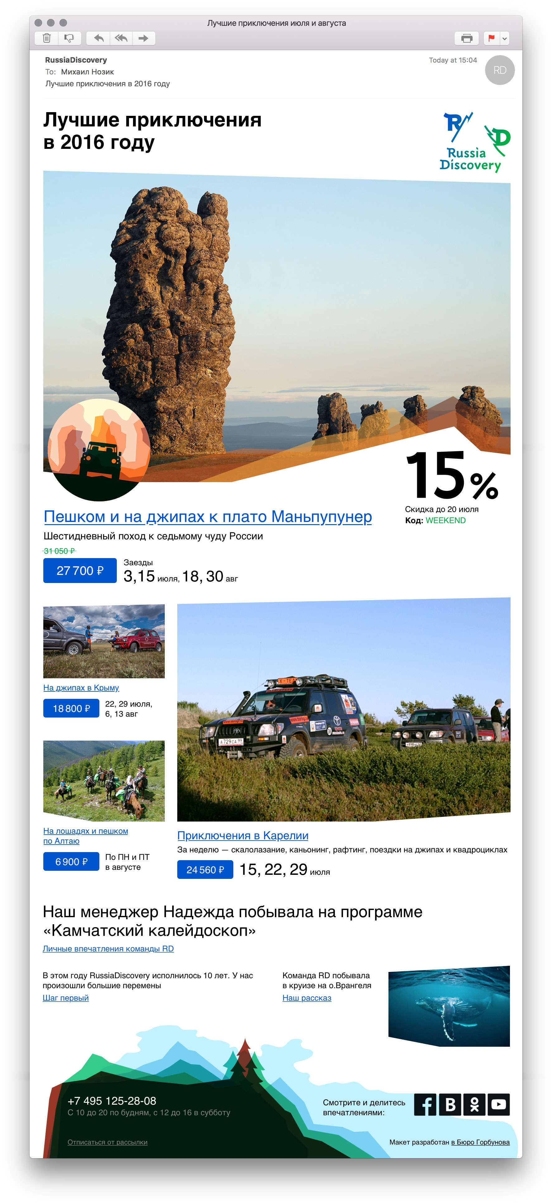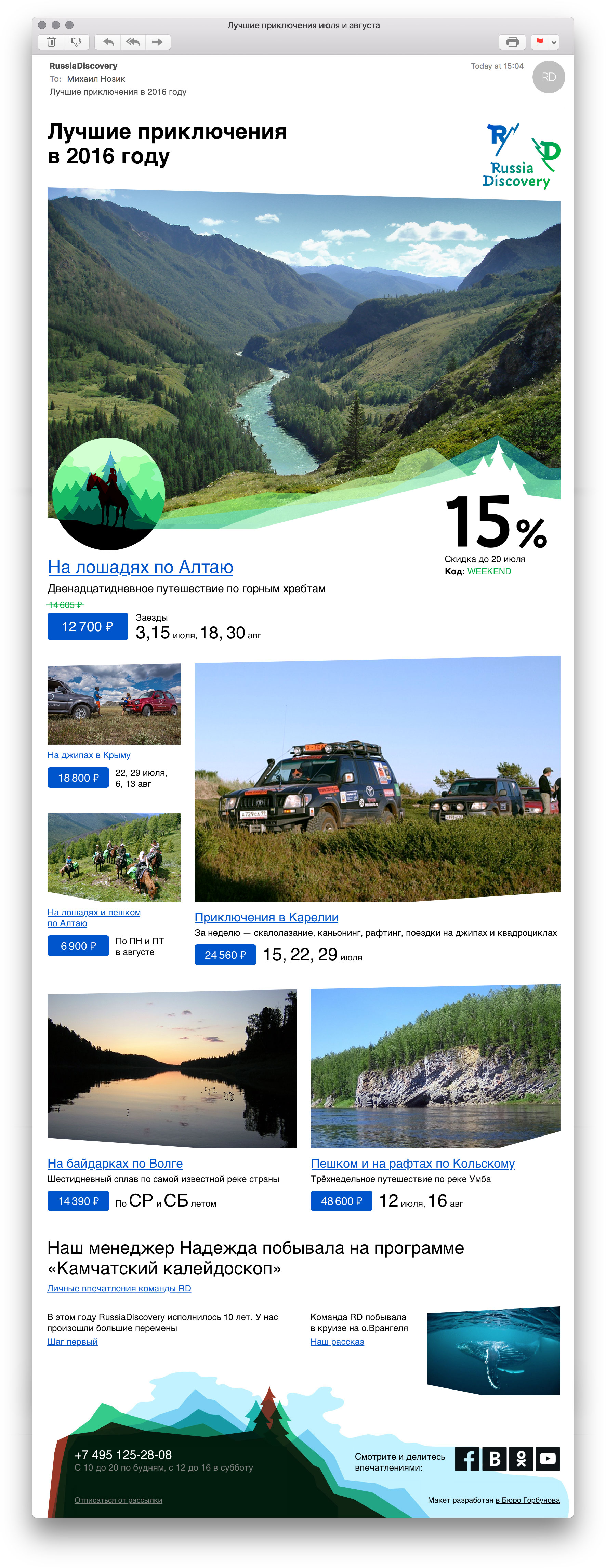 «РашаДискавери» рассылает своим клиентам письма о специальных предложениях и новых активных путешествиях по русскому северу, Арктике, Кавказу, Уралу, Алтаю, Сибири и Дальнему Востоку. В бюро разработали шаблоны писем: |