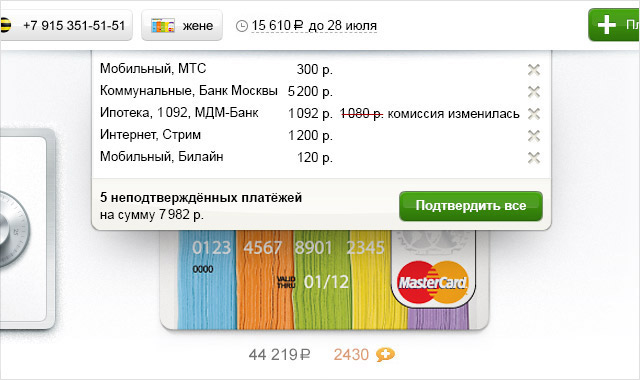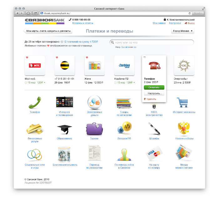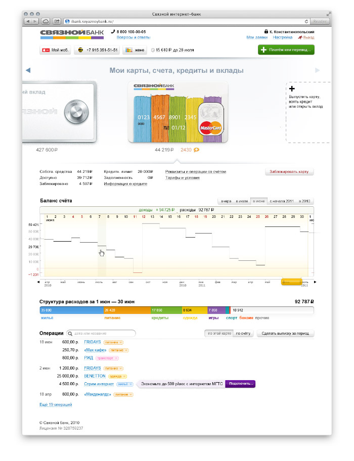 Клиенту ни к чему вникать в устройство мозга банкира. Его интересуют две вещи: контроль денег и оплата услуг. Поэтому интерфейс не содержит меню, а задачи, которые другие интернет-банки решают двадцатью пятью экранами, интернет-банк Связного решает двумя. На главном экране — контроль денег: |