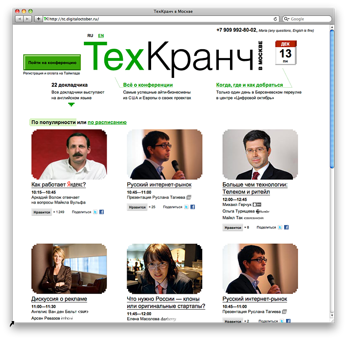 Сайт рассказывает о конференции, докладах и докладчиках, месте проведения и регистрации: |
