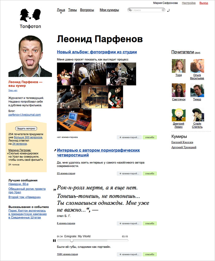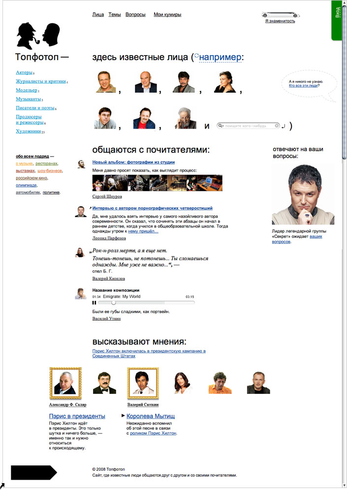 В новом стиле «Топфотопа» используются силуэтные портреты. У разных почитателей — разные кумиры, поэтому мы предложили внести в логотип элемент игры в узнавание: |