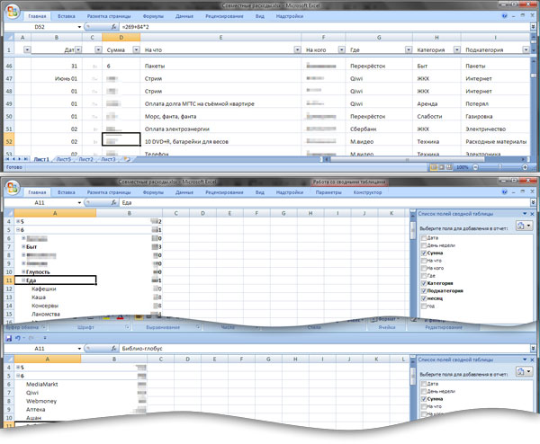 В них данные можно сгруппировать как угодно. Например, посмотреть по месяцам, на что я потратил сколько денег. Или где я их потратил. Или на кого. Или в какие дни недели траты самые значительные. Ну и так далее по всем полям. Причём порядок группировки полей тоже произвольный.