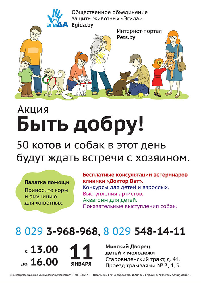 Результат меня не устраивает, повторюсь, из‑за картинки. Текущая не имеет объёма, не цепляет зрителя, не из мира клиента; она лишь выражает «мечту менеджера» — придут люди и заберут животных. Объекты плоские, штрихи конкурируют со штрихами мелкого текста, динамики нет — все стоят или сидят. Картинка «попадает» в детский стиль рисования, но это не является ни плюсом, ни минусом.