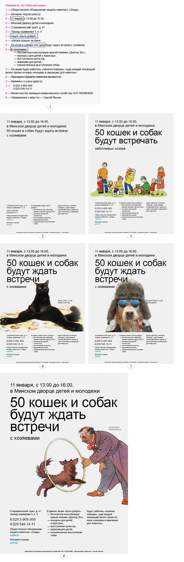 Кроме того, лучше иметь два плаката — один для собачатников, другой — для кошководов. Я хочу показать, как животные ждут — но без соплей, по‑геройски. Например, кошка будет вальяжно сидеть, а собака — курить трубку. Третий пример будет с иллюстрацией Генриха Валька.