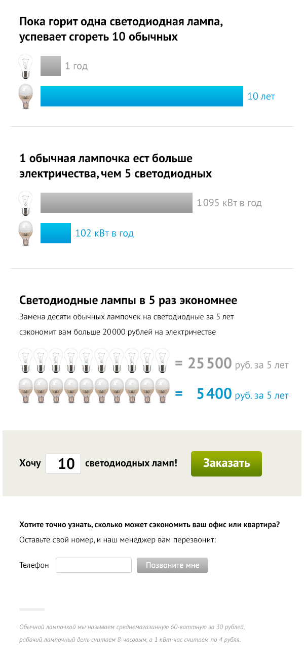 Вы пишете: «Цель: показать посетителю, сколько он сэкономит, используя светодиодное освещение». Возможно, я не прав, но у меня подозрение, что это не цель, а ваше решение, которое вы по ошибке приняли за цель. Настоящая цель, как я предполагаю, помочь покупателю понять, что светодиодные лампы выгоднее ламп накаливания. Вот и первое предложение готово: