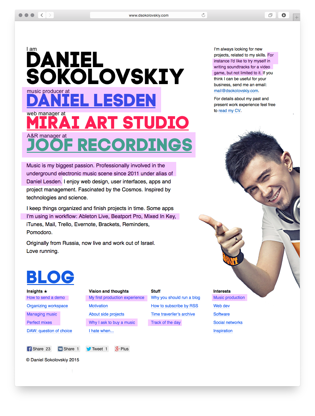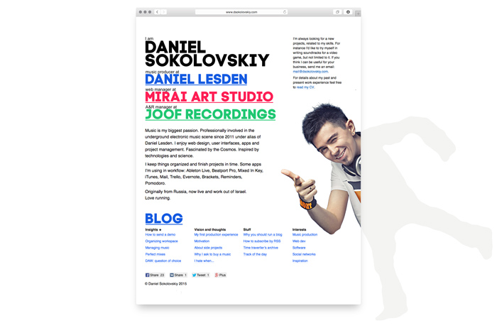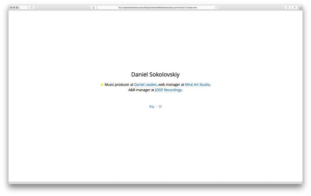 Направление верное, но одной только фотографии недостаточно, чтобы создать настроение: поставь другую фотографию и получишь сайт другого человека. Чтобы добавить ещё больше индивидуальности, напишем имя и место работы интересным гротеском: