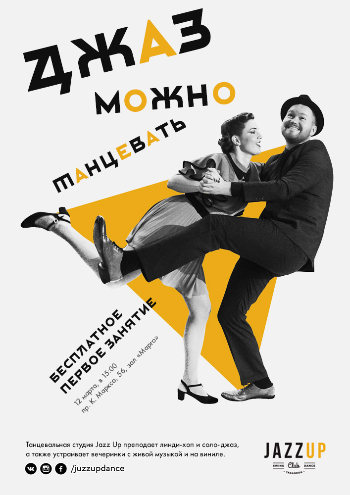 Кажется, очень здорово смотрелась бы серия плакатов. Один жанр — один плакат. И чтобы в каждом были свои танцоры, цвет и геометрическая фигура на фоне.