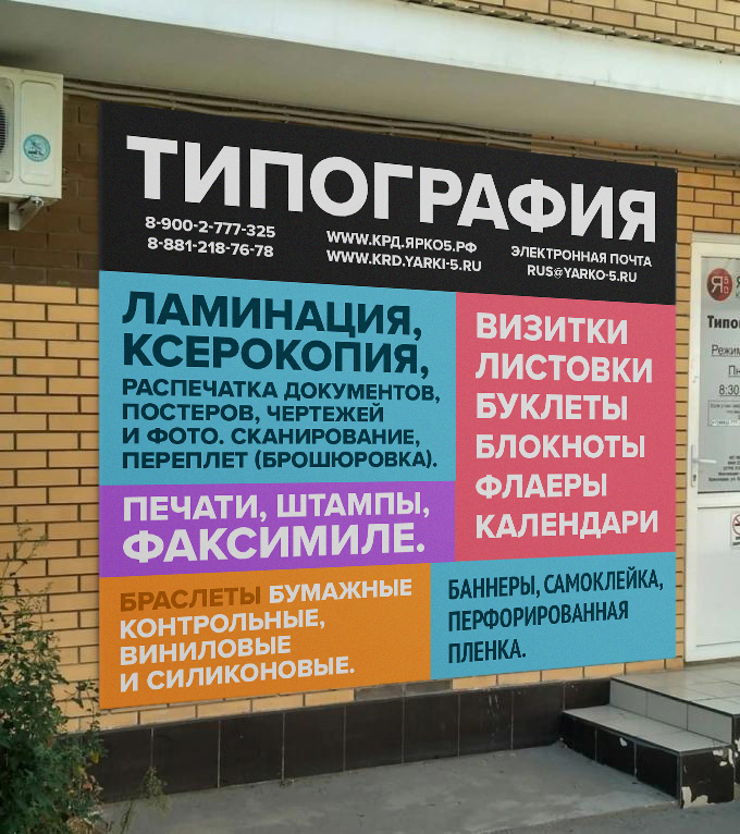 С первого взгляда прохожий увидит слово «Типография» и, если повезёт, «Ксерокопию» и «Факсимиле» — потому что они выделяются цветом и фоном.