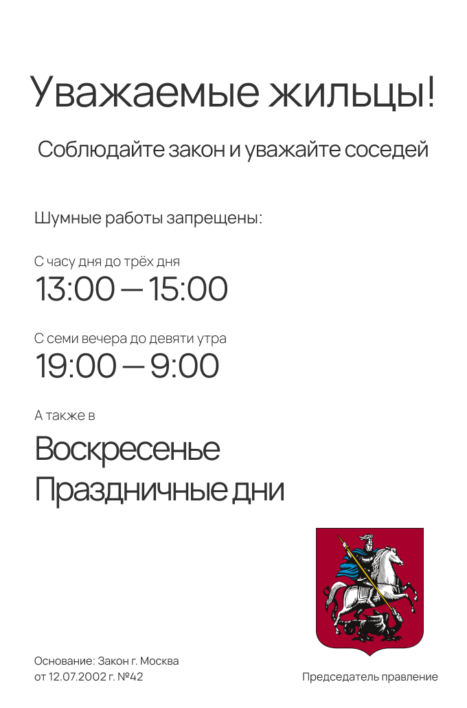 Пожалуйста, делайте шумный ремонт только с 9 до 13 и с 15 до 19 в рабочие дни и по субботам.